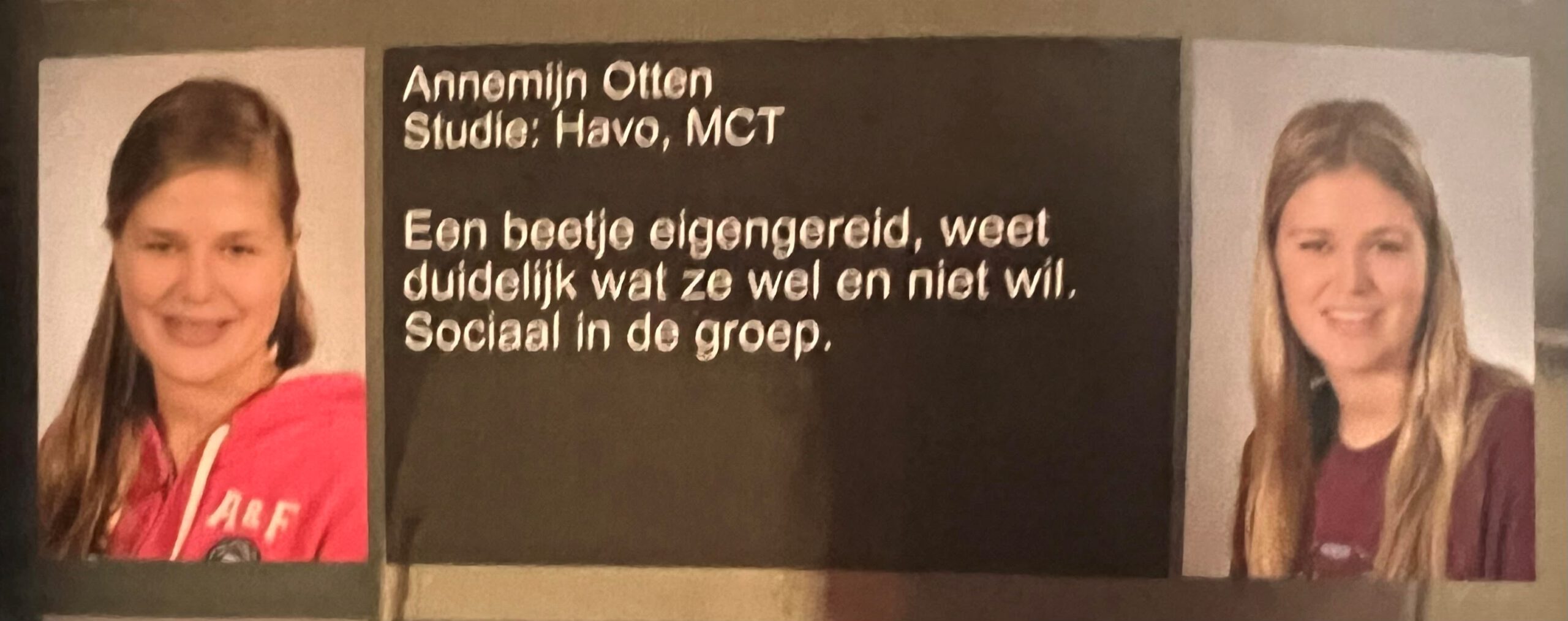 Haar lievelingsvakken op Montessori College Twente waren economie en geschiedenis. Die leraren vond zij dan ook het leukst, ‘maar dat komt misschien omdat… als je een vak hebt dat je zelf leuk vindt, dan sta je natuurlijk overal open voor.’ Zij denkt dat het een win-win situatie was: ‘Ik vond die leraren leuk, dus hun vak ook, en omdat ik het vak interessant vond, waren die leraren ook aardig tegen mij. Voor geschiedenis had ik Jente Pots, echt een lieve, respectvolle man en bovenal een goede leraar. Hij was tegen iedereen aardig, ongeacht de achtergrond. En dan hadden we voor economie Kay Meulenbroek, ook echt een leuke, vriendelijke en slimme leraar. Die twee zijn me het meest bijgebleven, want ik heb in de loop der jaren voor die vakken meerdere leraren gehad. Die twee vakken gingen mij dus ook makkelijk af, maar natuurlijk waren er ook docenten met wie en vakken waarmee ik minder had. En zij met mij natuurlijk, haha.’