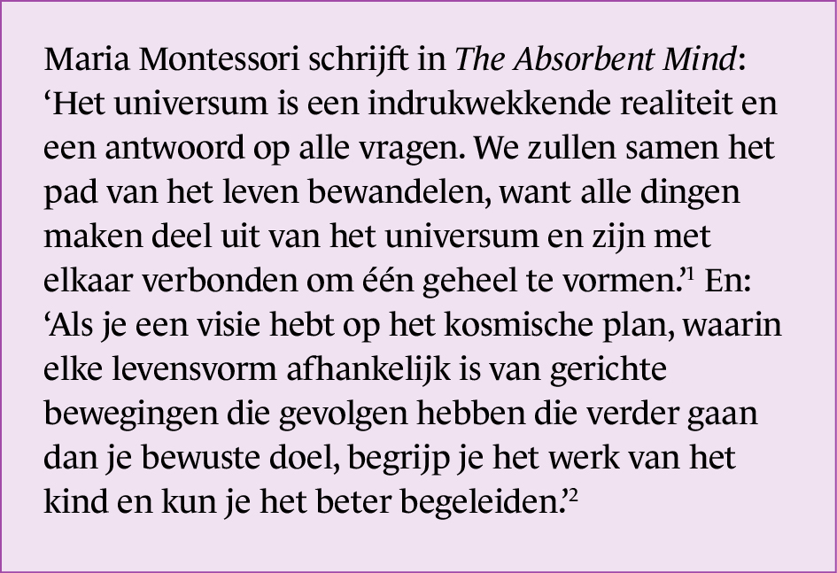 Jansen: ‘Het universum is. Het één kan niet zonder het ander. Eb en vloed, lichaam en geest, en ook de seizoenen, alles hoort bij elkaar. In de ontwikkeling van baby, dreumes en peuter gebruik ik de term kosmisch onderwijs nooit, het is vooral een term passend bij de ontwikkeling van kinderen vanaf 6 jaar, welke Montessori de periode van verkenning en wetenschap noemt, van 6 tot 12 jaar, en doorlopend in de periode van maatschappelijke gerichtheid van 12 tot 18 jaar. Het fundament is naar zijn aard kosmisch, jonge kinderen voelen zich nog één met alles en iedereen.’