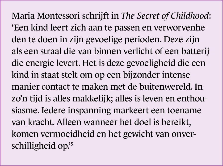 Hoe dat er uit zit op de groep? ‘De gevoelige periodes vertellen ons waar de behoeftes liggen. Er spelen altijd meerdere gevoelige periodes naast elkaar. Ons vak is er een van zaadjes planten en geduld hebben. In het werken met jonge kinderen is bijvoorbeeld de dagstructuur van belang, en dan bedoel ik de volgorde der dingen. De duur van de activiteiten is fluïde naar de behoefte van de kinderen, maar de volgorde is hun houvast. De tijdsduur volgt de behoefte van de kinderen, het horloge is typisch iets van volwassenen’, zegt Jansen met een knipoog.