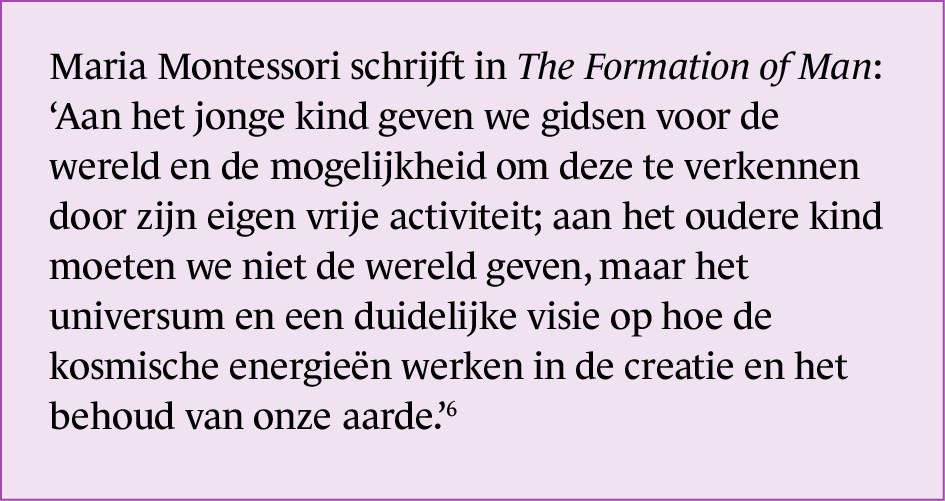 En vervolgt ze: ‘Juist omdat kinderen tot een jaar of zes nog magisch denken, maken zij nog geen onderscheid tussen henzelf en de rest van de wereld. Een voorbeeld: eerst ziet een kind alles op vier poten als dier. Dan leert hij onderscheid maken tussen katten, honden, koeien. Vervolgens leert hij dat er verschillende hondenrassen zijn, golden retrievers, teckels, herdershonden. Dit sterkt zijn begrip en om er verder betekenis aan te kunnen geven, leert het kind in deze eerste levensfase om de categorieën los te koppelen. Wij volgen en ondersteunen daarin hun ontwikkeling door hen eerst kennis te laten maken met al die puzzelstukjes, met zichzelf, met de wereld en met zichzelf in de wereld. Daarna wordt dit passend bij de volgende ontwikkelfases van verkenning en wetenschap en maatschappelijke gerichtheid, waarin ook het basis- en later voortgezet onderwijs zijn intrede doet, weer samengebracht onder de noemer kosmisch onderwijs. Begrip van de samenhang der dingen helpt hen dan verder om zich bewust te worden de grotere verbanden en hun rol en verantwoordelijkheden daarin.’
